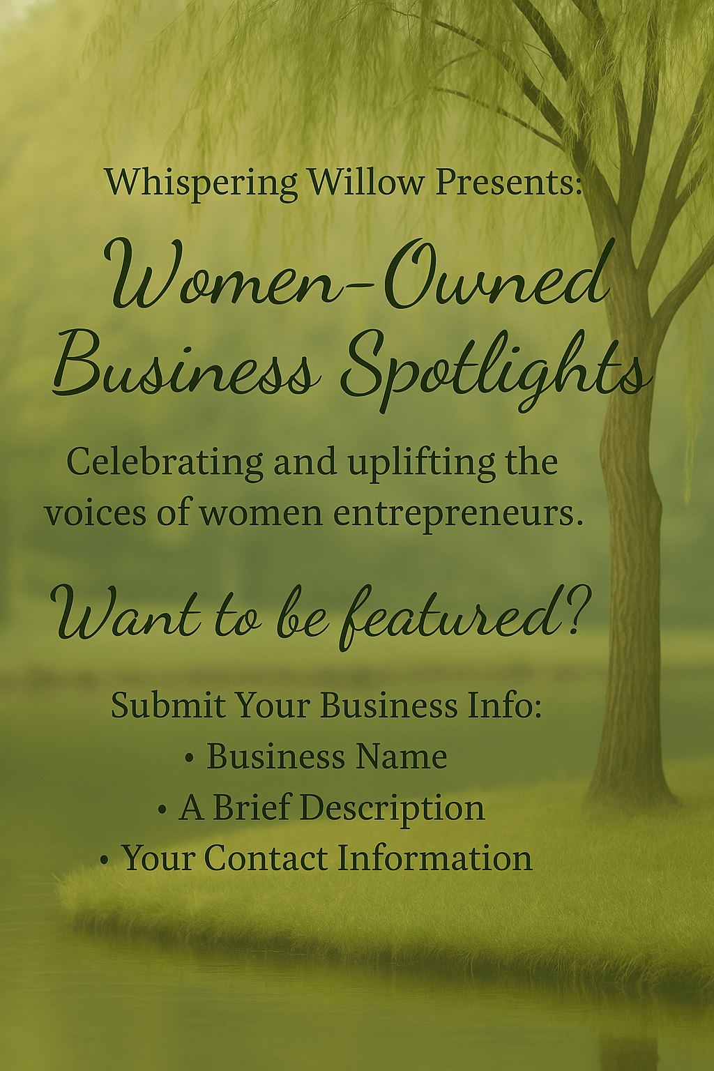 At Whispering Willow, stories have always been at the heart of what I do—whether they flow through personal reflections, poetry, or the shared experiences of others. Now, I’m expanding that vision to celebrate and amplify the voices of women entrepreneurs who are shaping communities, creating beauty, and building legacies.