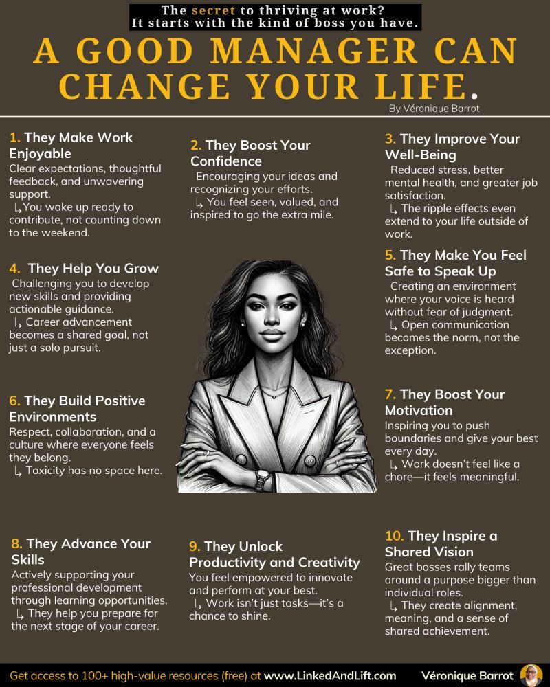 A good manager: ✨ Listens and values your perspective ✨ Encourages personal and professional development ✨ Leads with empathy and respect ✨ Creates a culture of collaboration and support ✨ Inspires confidence and ambition