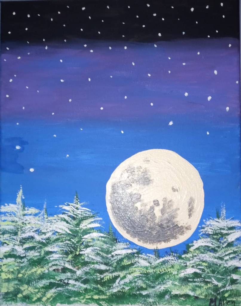 A blanket of untouched snow stretches beneath towering evergreens in the silent forest, their branches heavy with the quiet weight of frost. The silver glow of the full moon bathes the forest in ethereal light, casting gentle shadows that dance upon the crystalline surface.