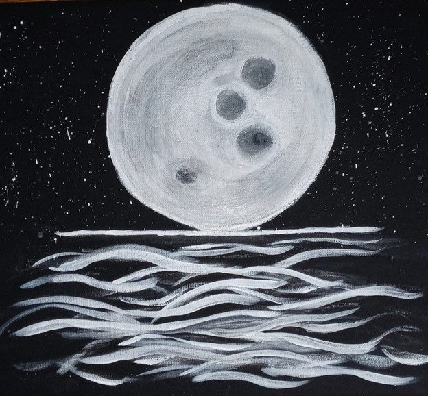 A luminous moon hangs in quiet reverence above the water’s surface, its silvery reflection rippling softly in the stillness of the night. The stars, distant and eternal, watch over the tranquil expanse, adding depth to the vast, shadowed sky.