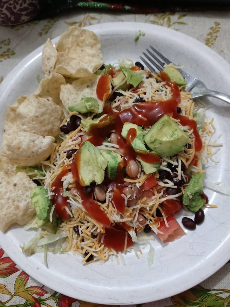 A generous serving of crisp chopped romaine forms the base, layered with black and pinto beans for hearty protein. Juicy grape tomatoes glisten beside creamy avocado cubes, and shredded pepper jack cheese adds a gentle kick. Everything’s pulled together with a lush drizzle of red dressing—my personal favorite Western Sweet & Smooth French or you can make the homemade avocado-lime version.